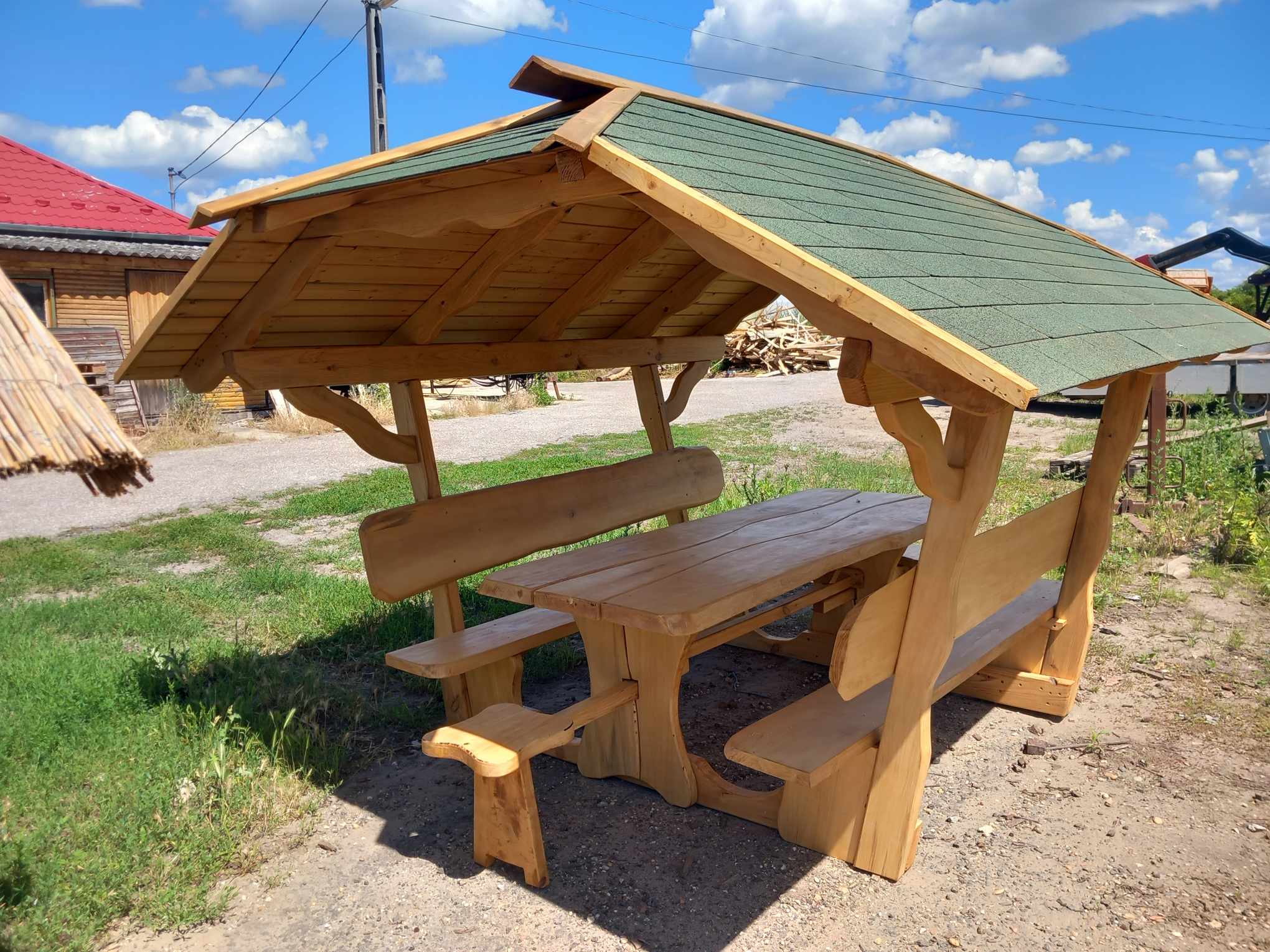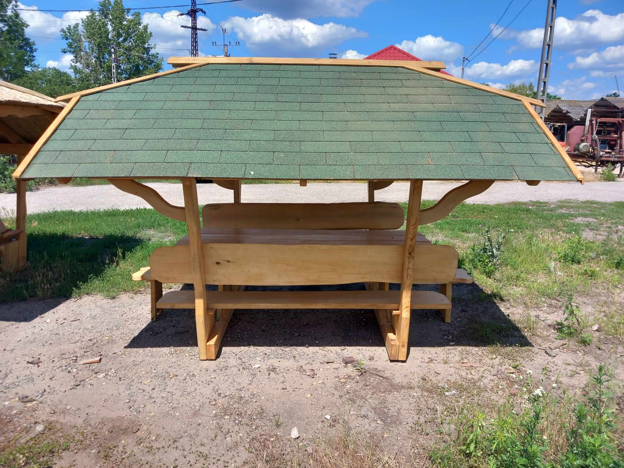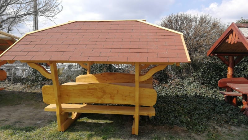 10+2 személyes zsindelyes kontyolt tetős kiülő (asztal hosszúsága 2,30 m, asztal szélessége kb. 90 cm, teljes alapterülete 2,10 m x 1,75 m, 10 plusz 2 személyes (asztal két végén kihúzható ülőke) tető: zsindely, melynek mérete kb 3,10 m széles x 3,60 m hosszú). Fa termékeink tölgy, világos narancs, sötét narancs, mahagóni, dió, paliszander színben rendelhetőek. FELHÍVJUK FIGYELMÜKET, HOGY FA TERMÉKEINK TERMÉSZETES FÁBÓL KÉSZÜLNEK, ÍGY ELŐFORDULHATNAK RAJTUK TÖKÉLETLENSÉGEK.