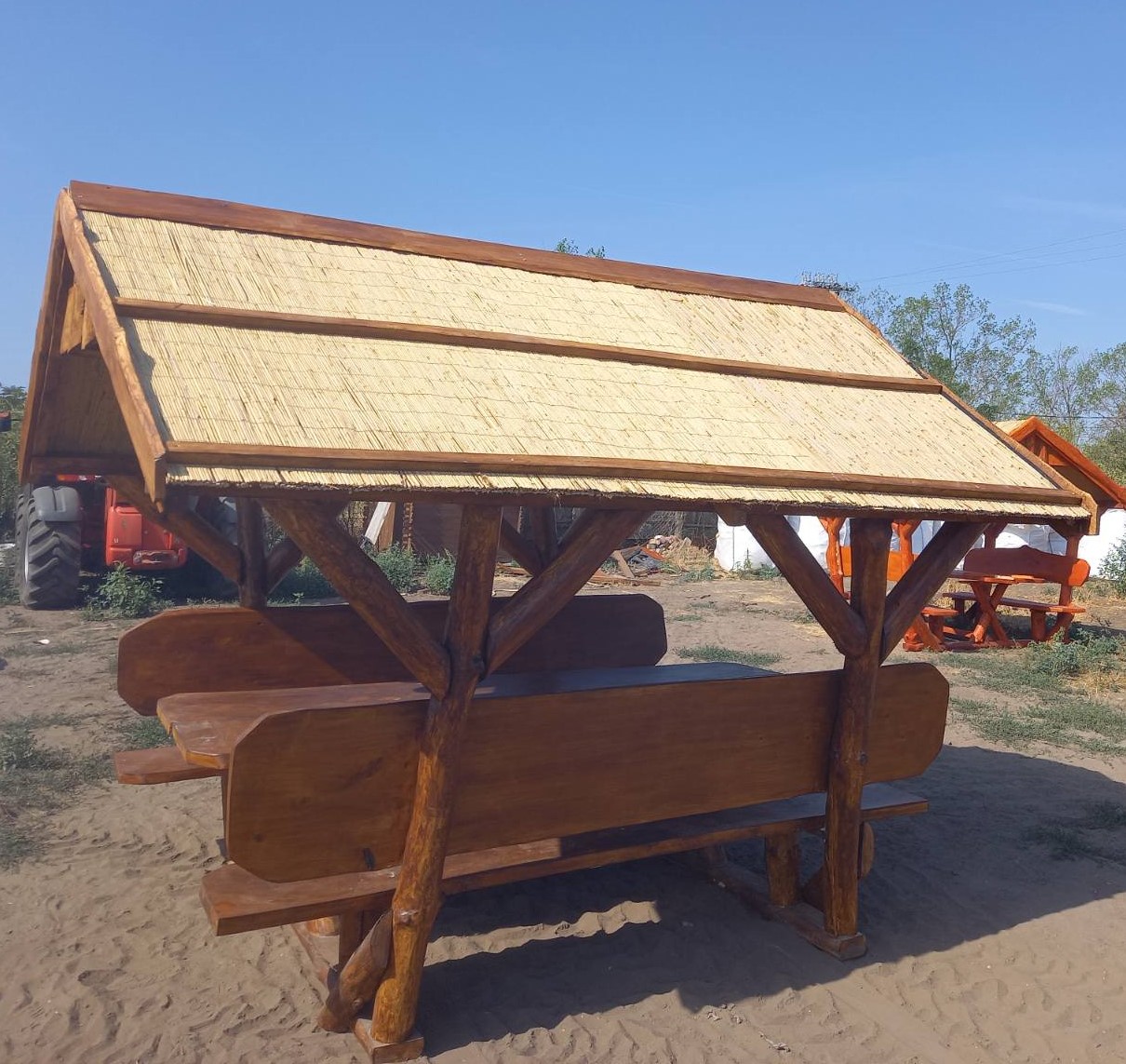 Asztal és padok hosszúsága 2,5 m, tető 3 m, alapterülete 2 m széles, 2 m hosszú, a tető szélesség 2,8 m. Fa termékeink tölgy, világos narancs, sötét narancs, mahagóni, dió, paliszander színben rendelhetőek. FELHÍVJUK FIGYELMÜKET, HOGY FA TERMÉKEINK TERMÉSZETES FÁBÓL KÉSZÜLNEK, ÍGY ELŐFORDULHATNAK RAJTUK TÖKÉLETLENSÉGEK. Nádtetős kiülőink zsindelytetővel is rendelhetők. Az ár miatt kérjük, érdeklődjön telefonon.