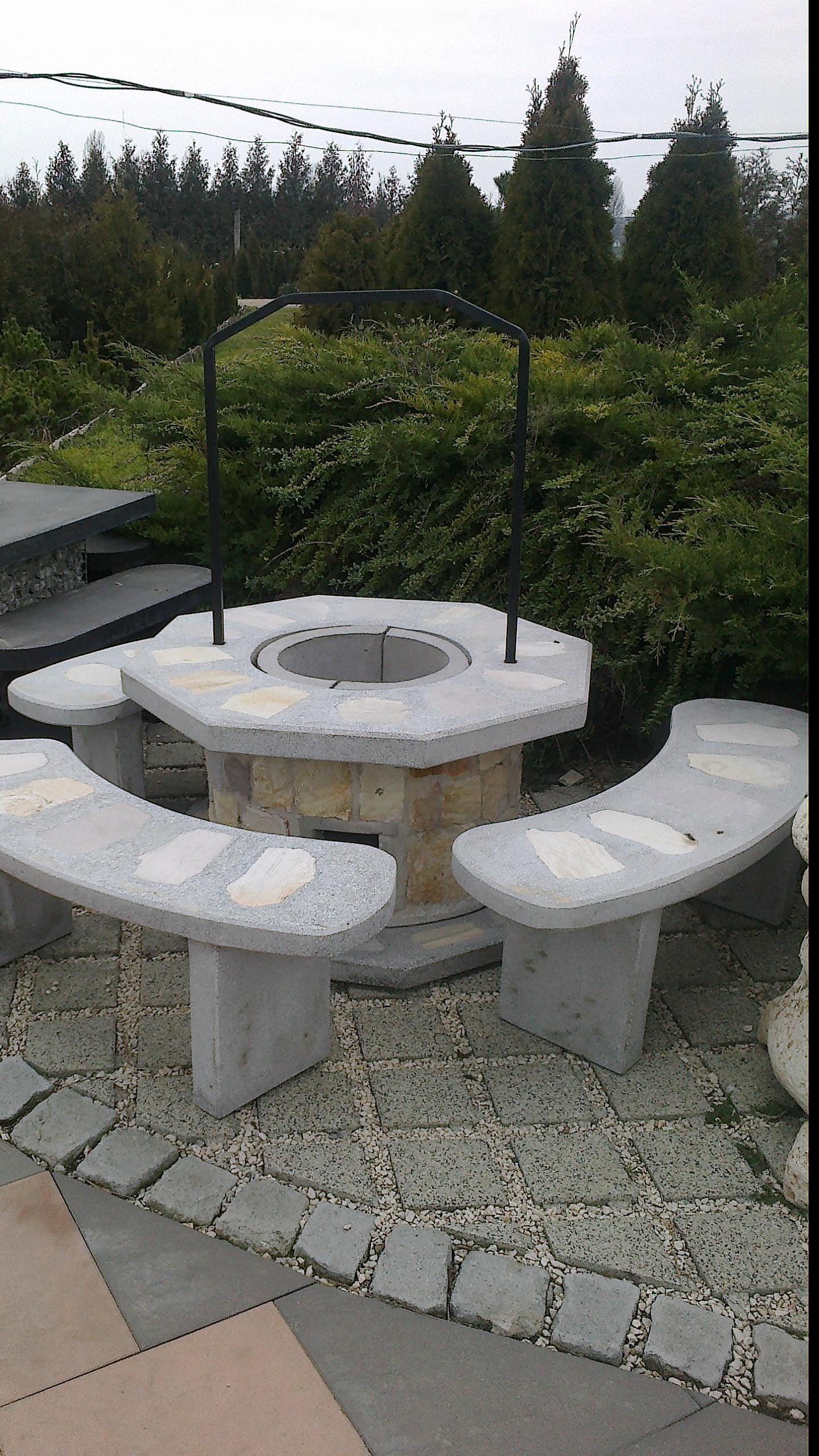 Átmérő 100 cm, magasság 52 cm, műkő fedlap, beton tűztér, Gyöngyössolymosi kődíszítéssel. A házán a hőtágulás következtében kialakulhatnak hajszál repedések, melyek nincsenek hatással a kerti grill működésére. Minden esetben lassan melegítsük fel a kerti grillt. Esős idő után érdemes elkerülni a hirtelen nagy láng kialakulását, mert ez könnyen végzetes repedésekhez, töréshez vezethet. A tüzet mindig hagyjuk magától elaludni, soha sem szabad vízzel lelocsolni, mert a hirtelen hőmérsékletváltozás ugyancsak törést idézhet elő. Téli időszakban, amikor nem használjuk, fóliával le kell takarni, hogy az esetlegesen belekerült víz a hideg hatására jéggé fagyva ne repessze szét.